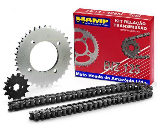Quantidade da embalagem – 1 Corrente, 1 coroa, 1 pinhão.